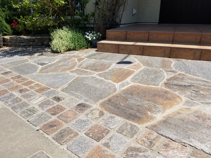 天然石のアプローチ。小さな四角形と乱形を組み合わせてデザインしました。